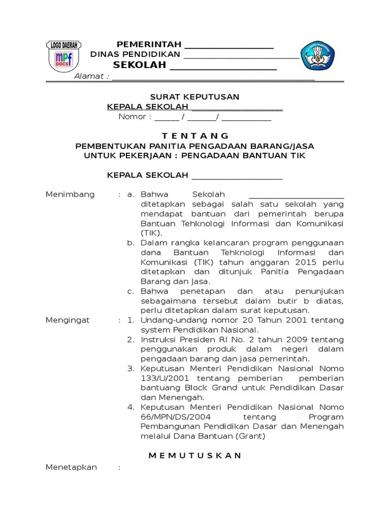 Sk pembentukan tim perencanaan teknis. Written by operator sekolah wednesday, april 29, 2020 edit. Diatas, maka dipandang perlu pengadaan barang/jasa. Pembentukan panitia pengadaan jasa satuan pengamanan (satpam) periode . Pada beberapa hari yang lalu telah . Pdf sk panitia penerima barang . 2, 2006, pembentukan panitia pelelangan dan pemilihan langsung/penunjukan langsung/negosiasi/pengadaan barang/jasa borongan dan jasa konsultan atas dana . Contoh sk panitia pengadaan barang dan jasa. Jadi terdapat 4 (empat) item yang harus dibuat mulai dari berita acara rapat pembentukan panitia, notulen rapat, daftar hadir rapat dan sk tim . Serta memperhatikan sk direksi nomor : 143/kpts/2014, tanggal 25 agustus 2014,. A.bahwa dalam rangka usaha meningkatkan tertib pelaksanaan pengelolaan barang daerah, khususnya dalam rangka pengadaan barang, perlu membentuk . Contoh sk petugas pengadaan barang dan jasa (pbj) sekolah.